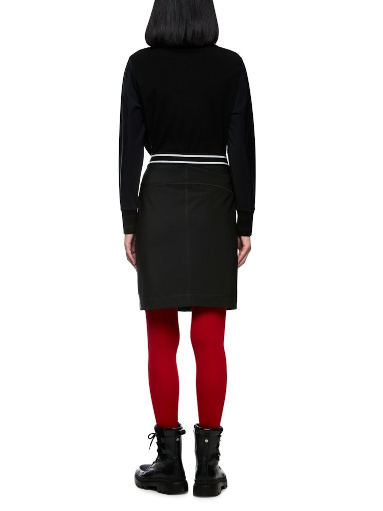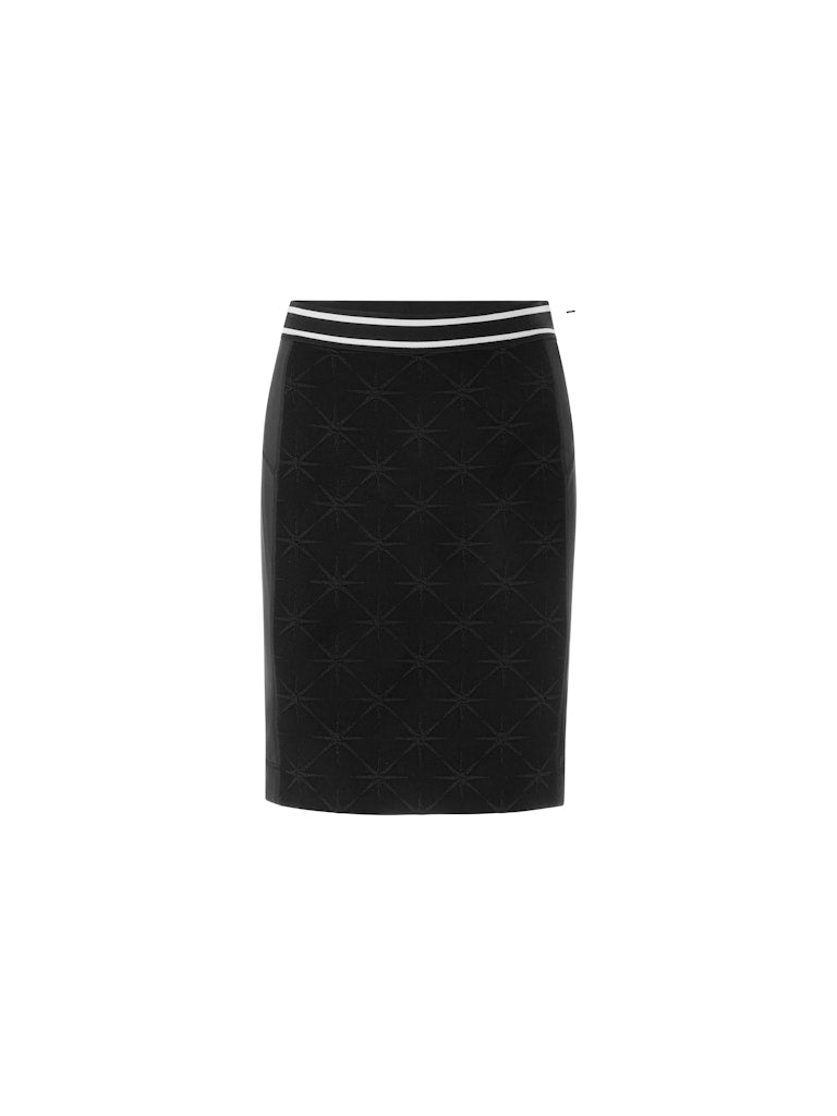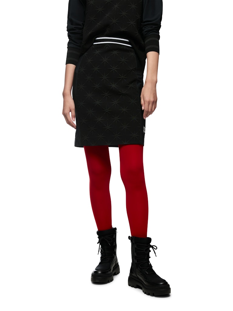 Kurzer, figurbetonter Rock in Bleistiftform. Das Vorderteil besteht aus einem hochwertigen Jacquard-Stoff mit eingewebtem Snowstar-Design. Der Gummibund im sportlichen Streifen-Look sorgt für angenehmen Tragekomfort und einen modernen Akzent. Ideal kombinierbar für sportive oder elegante Winter-Looks. Der Rock wird am Standort Deutschland gestrickt und auch veredelt. Die Weiterverarbeitung der einzelnen Teile erfolgt in europäischen Partnerbetrieben. Damit ist das Modell „Knitted in Germany“.